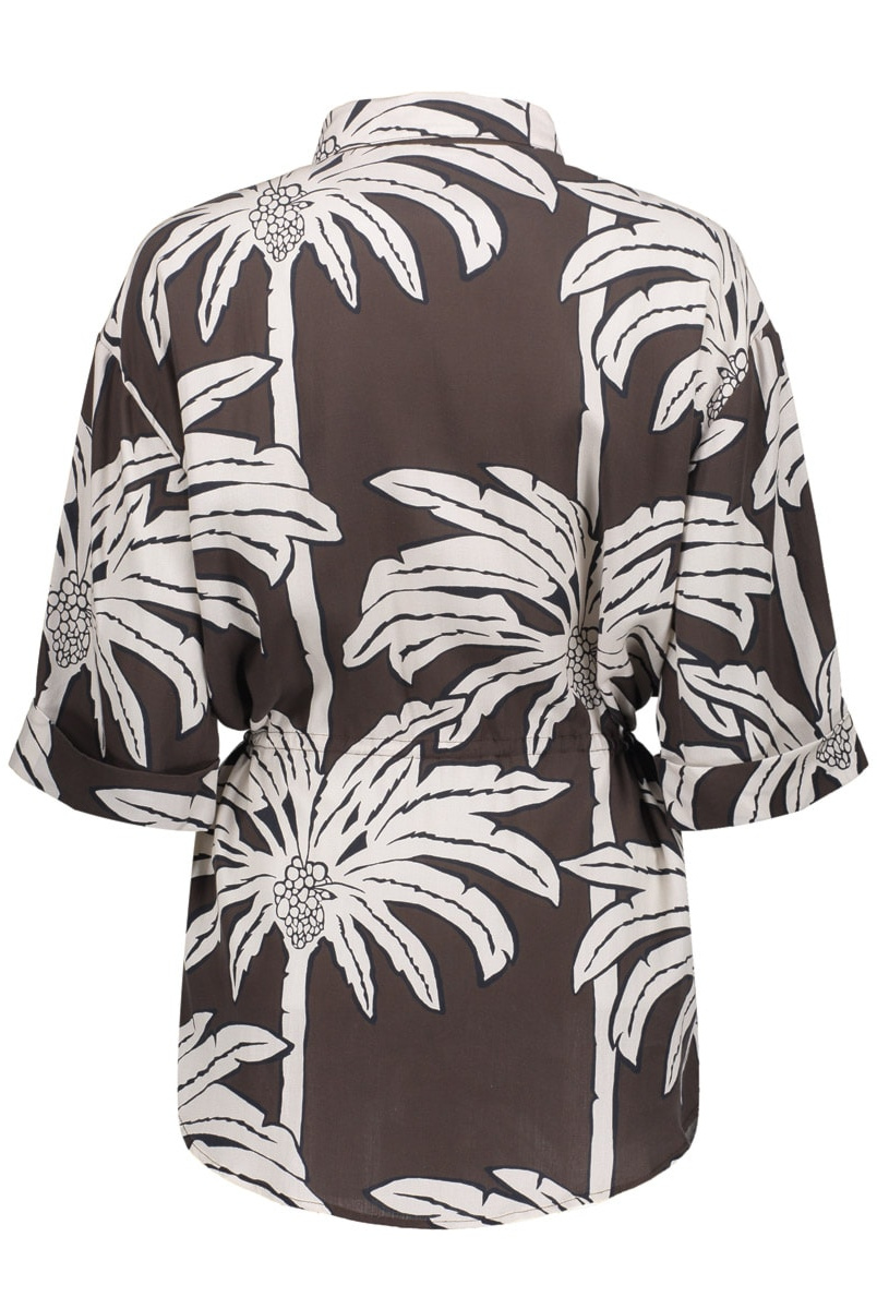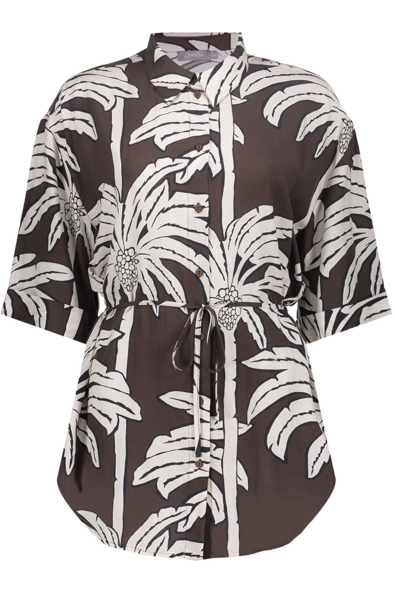 Geisha blouse met ceintuur. Deze blouse uit onze S26-1 collectie heeft een palmprint in warme bruintinten. De klassieke kraag en volledige knoopsluiting geven een tijdloze uitstraling, terwijl de 3/4 losvallende mouwen zorgen voor een nonchalante touch. Met de strikceintuur accentueer je subtiel de taille en creëer je een vrouwelijk silhouet.