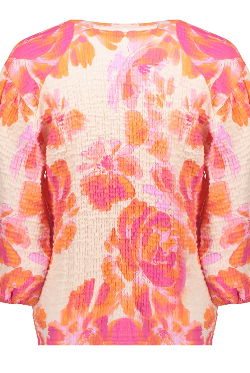 Deze dames blouse uit onze S26-2 collectie is uitgevoerd in een luchtige mousseline kwaliteit met een expressieve bloemenprint in warme roze- en oranjetinten. De ronde hals met V-inkeping en doorknoopsluiting geven het ontwerp een zachte, maar rijke uitstraling. De 3/4 pofmouwen met elastische manchetten zorgen voor volume en balans. Een licht en uitgesproken item dat perfect combineert binnen de co-ord set.