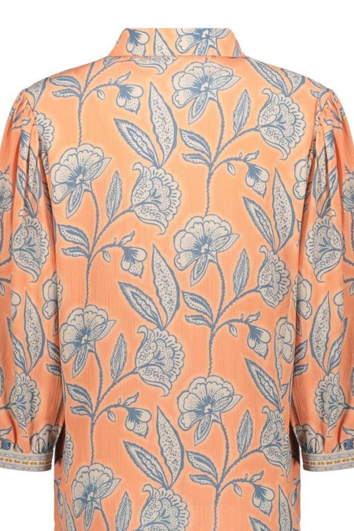 Deze blouse uit onze S26-1 collectie is uitgevoerd in een zachte peach tint met een verfijnd botanisch bloemendessin. De soepele kwaliteit draagt comfortabel en geeft een vrouwelijke uitstraling. De decoratieve manchetten en klassieke kraag zorgen voor een elegante finishing touch.