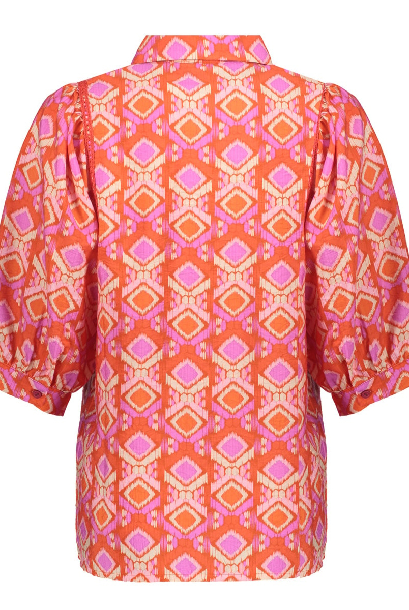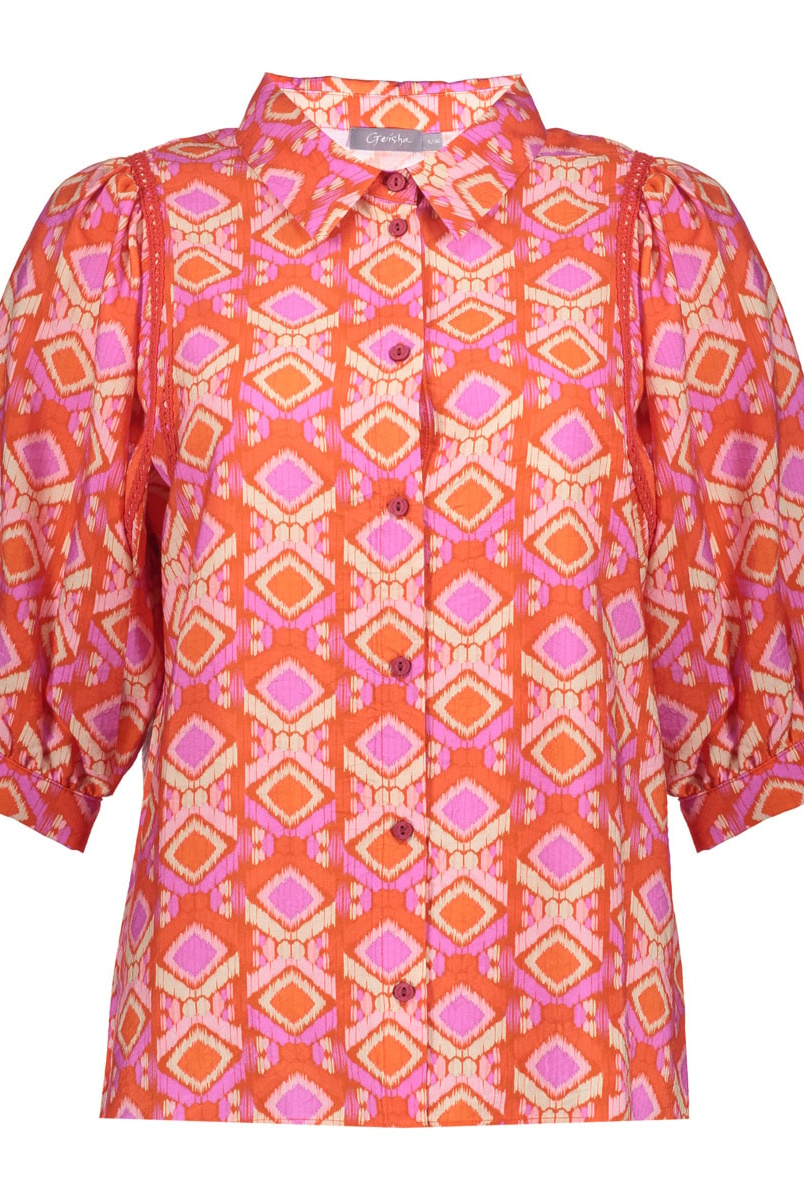 Geisha blouse met kleurrijke grafische print. Deze blouse uit onze S26-1 collectie is een kleurrijke blikvanger. De grafische print in warme kleurrijke tinten geeft het ontwerp karakter, terwijl de klassieke kraag en volledige knoopsluiting zorgen voor een tijdloze basis. De korte mouw hebben een subtiele plooi door de manchetten en het recht losvallende model maken de blouse luchtig en stijlvol. Een alledaagse blouse die ook erg geschikt is voor een feestje