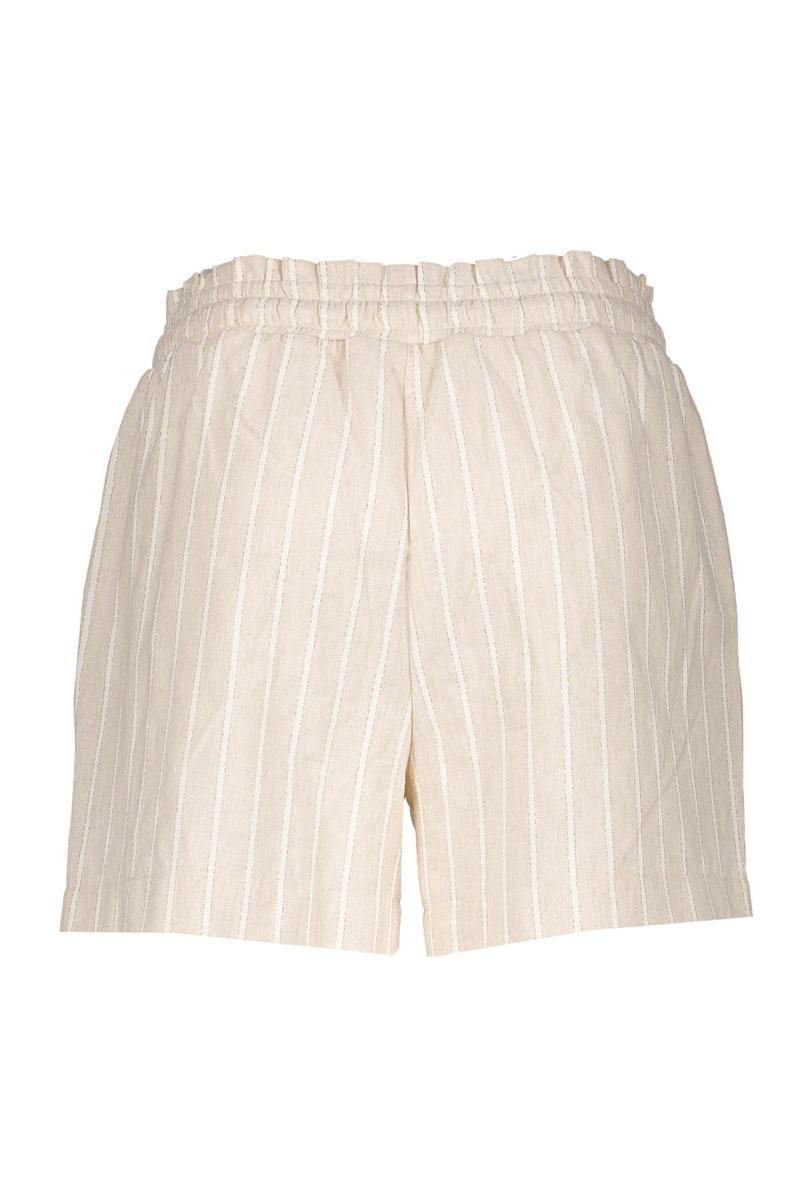 Deze short uit onze S26-1 collectie heeft een elegante pasvorm. De paperbag taille met elastische band en strikkoord zorgt voor een speelse, vrouwelijke fit. Het subtiele streeppatroon met lurex geeft een lichte shimmer. Dankzij de steekzakken en luchtige stof is deze dames short perfect als onderdeel van een stijlvolle co-ord set.