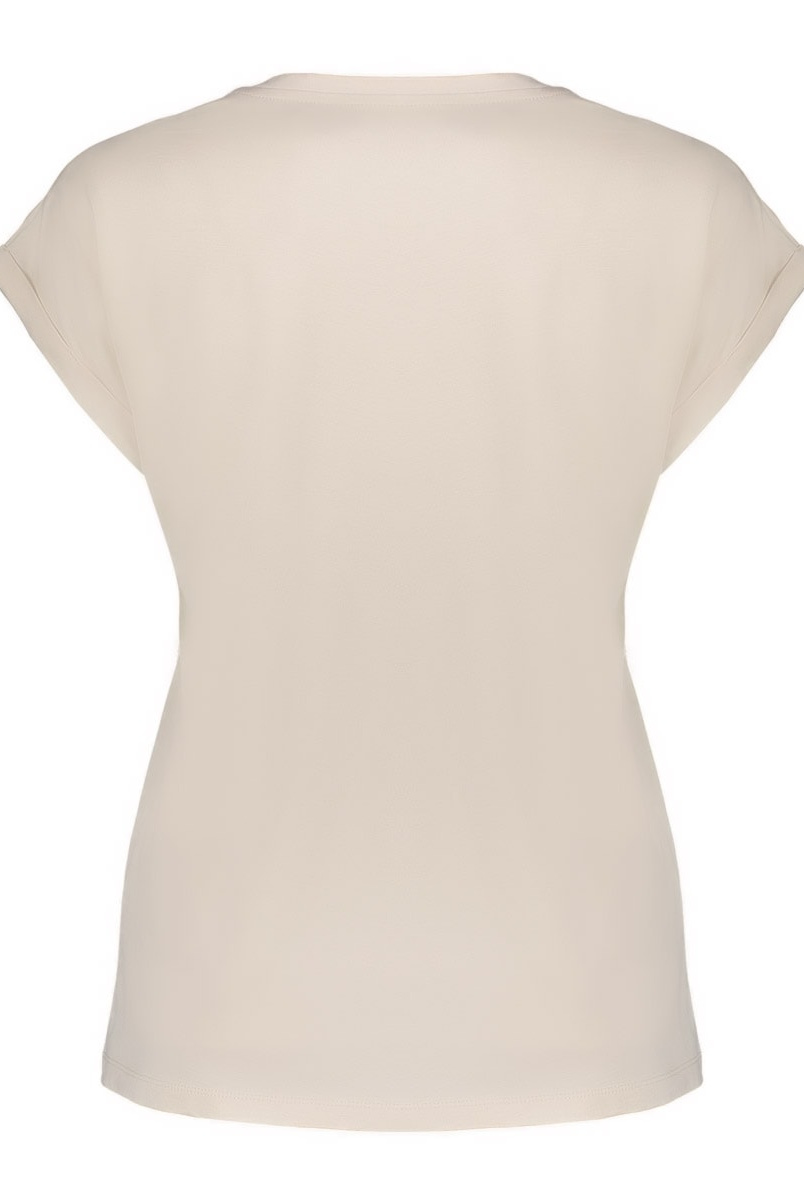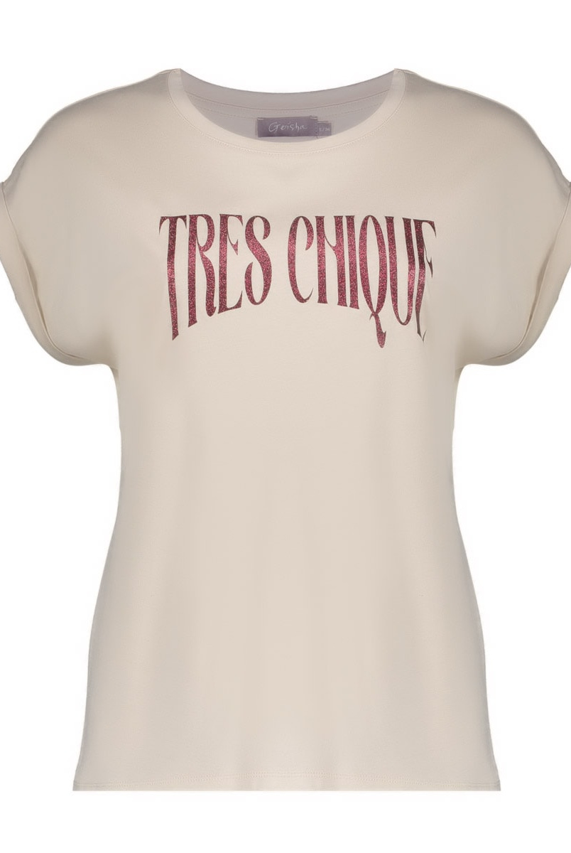 Dit T-shirt uit onze S26-1 collectie is een stijlvolle basic. Het beige T-shirt met ronde hals en omgeslagen mouwtjes krijgt extra flair door de opvallende “Tres Chique” print in warm rood. De zachte stof en het comfortabele model maken dit dames T-shirt perfect voor elke dag. Combineer met een jeans of blazer voor een casual look met een knipoog. Rechtvallend model