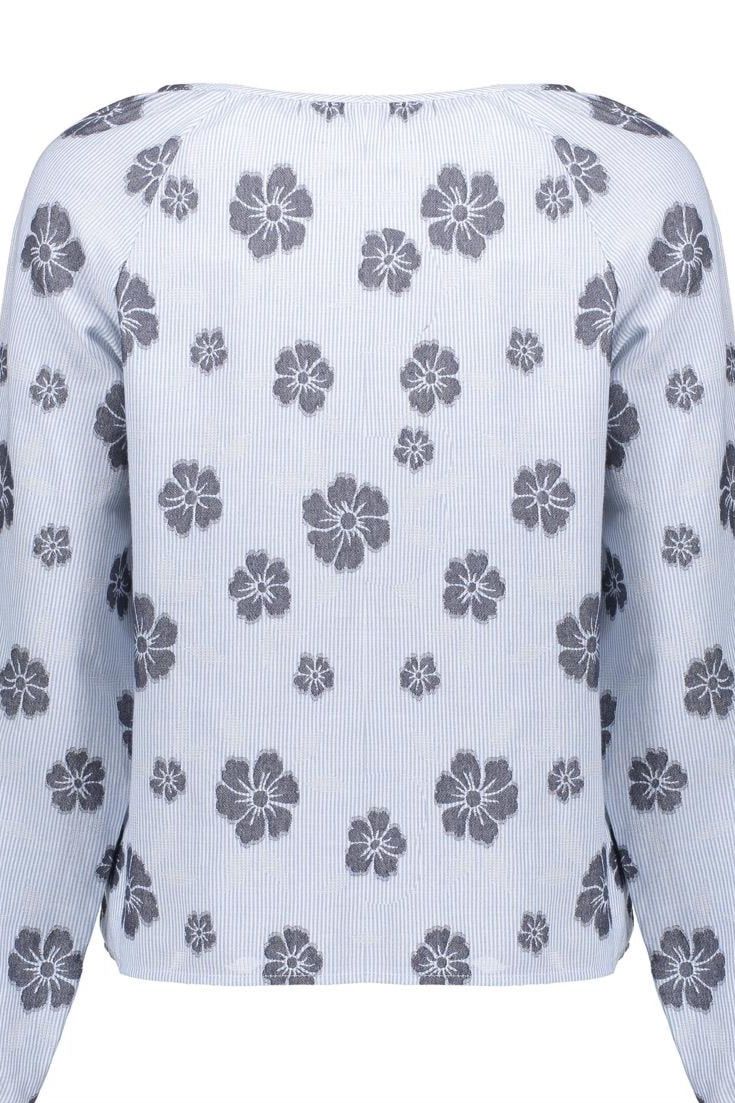 Deze blouse uit onze S26-1 collectie is uitgevoerd in cloud blue met een subtiele streepstructuur en een artistieke bloemenprint. De sierkoordjes met kwastjes bij de hals geven een speelse, verfijnde touch. De luchtige kwaliteit en ontspannen fit maken dit item ideaal voor de zomer.
