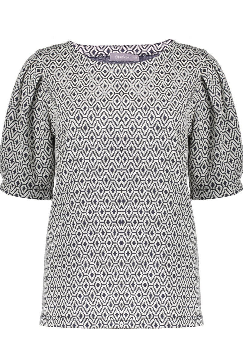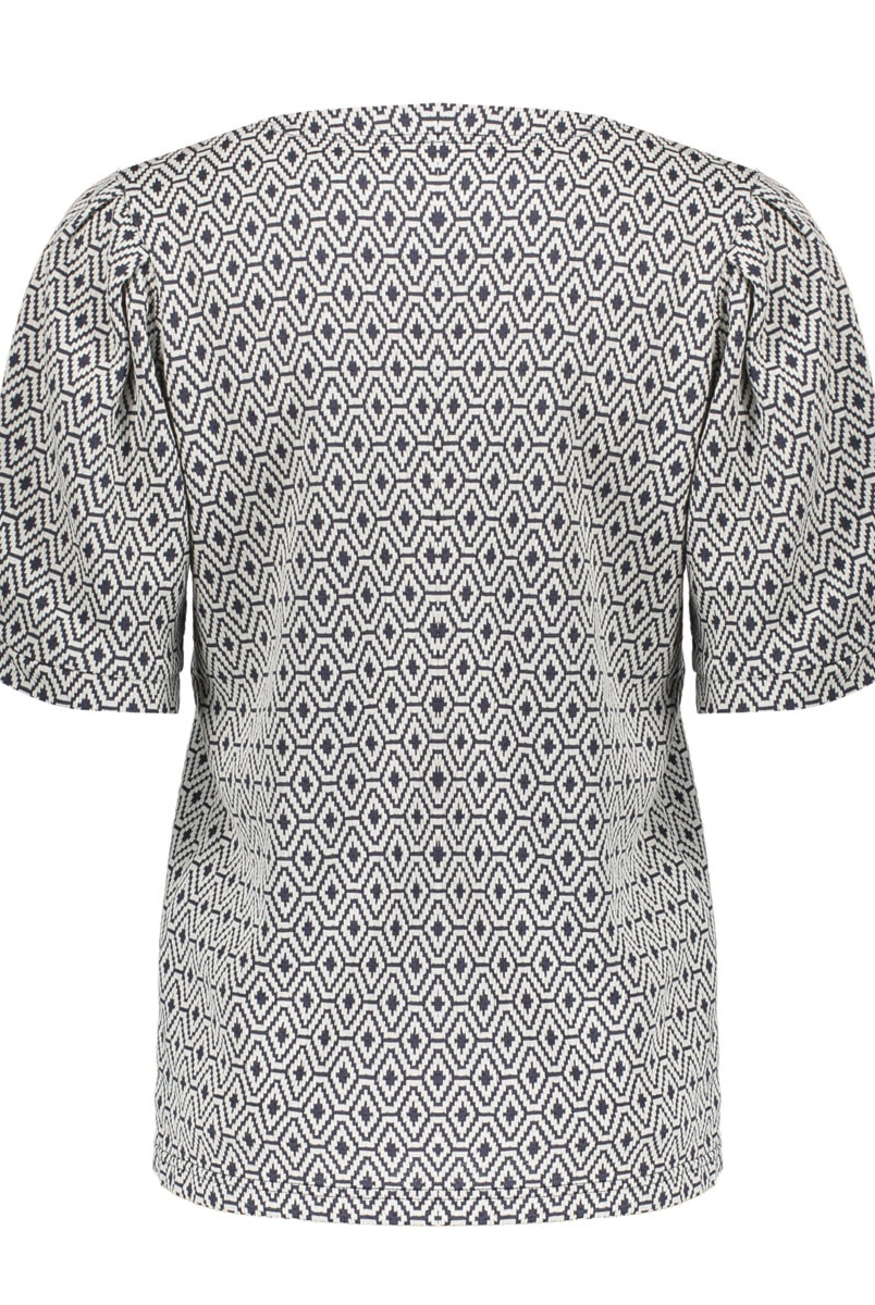 Deze top uit onze S26-1 collectie is een blikvanger met jacquard ruitenprint en elegante half lange pofmouwen. De rechte valling en ronde hals zorgen voor een vrouwelijke, moderne uitstraling. Draag als set met de bijpassende broek of combineer casual chic. De hoogwaardige kwaliteit voelt comfortabel en blijft mooi in vorm, ideaal voor werk, city trips en diners.