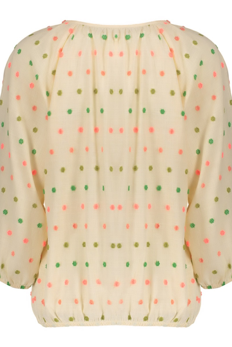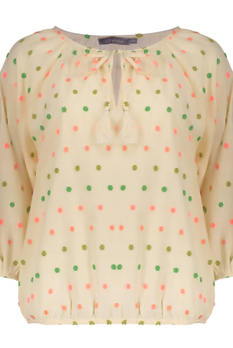 Deze top uit onze S26-1 collectie is een vrolijke toevoeging aan jouw kledingkast. De rechte valling en ronde hals met strikkoord en kwastjes zorgen voor een luchtige en zomerse uitstraling. Zowel de 3/4 mouwen als de zoom bij de taille zijn voorzien van elastiek en geven daarom extra comfort, terwijl de subtiele 3D flower embroidery het geheel een unieke, zomerse touch geeft.
