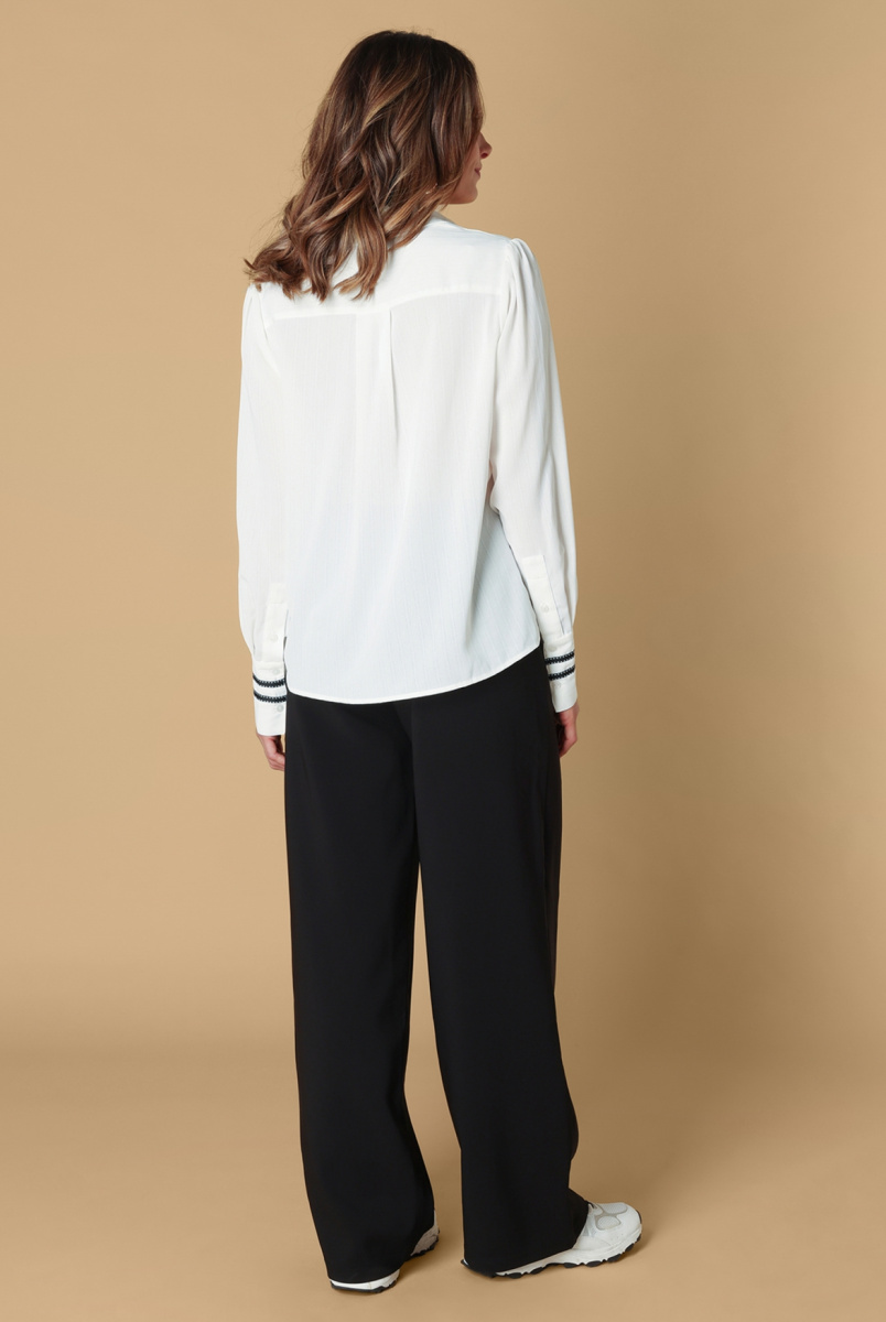 Blouse Sissi is minimalistisch met een twist. De zwarte bies langs manchet en zijnaad geeft deze off white blouse net dat grafische randje. Dankzij de vormvaste stof en blinde knoopsluiting oogt ze strak en stijlvol—perfect voor elke gelegenheid.