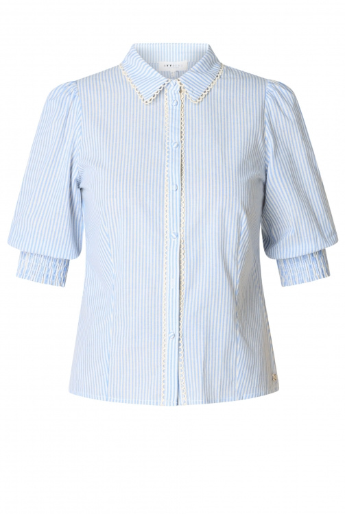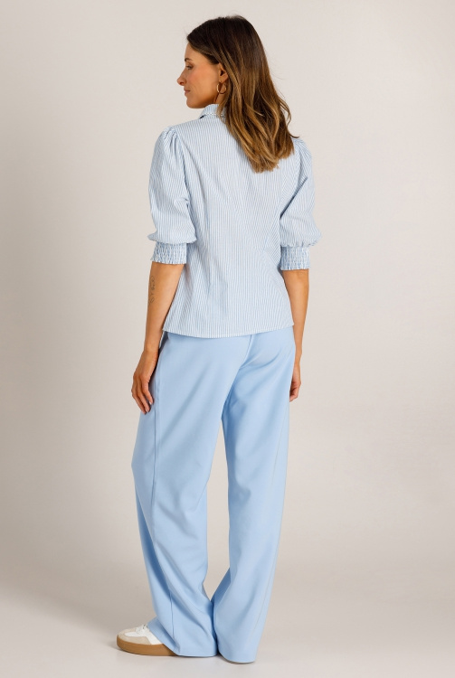 Zonnetje in de kast! Deze luchtige katoenen blouse heeft fijne streepjes, pofmouwen en een geschulpte kraag die het geheel een charmante look geeft. Dankzij de elastische manchetten zit ze heerlijk. Materiaal:100% Cotton