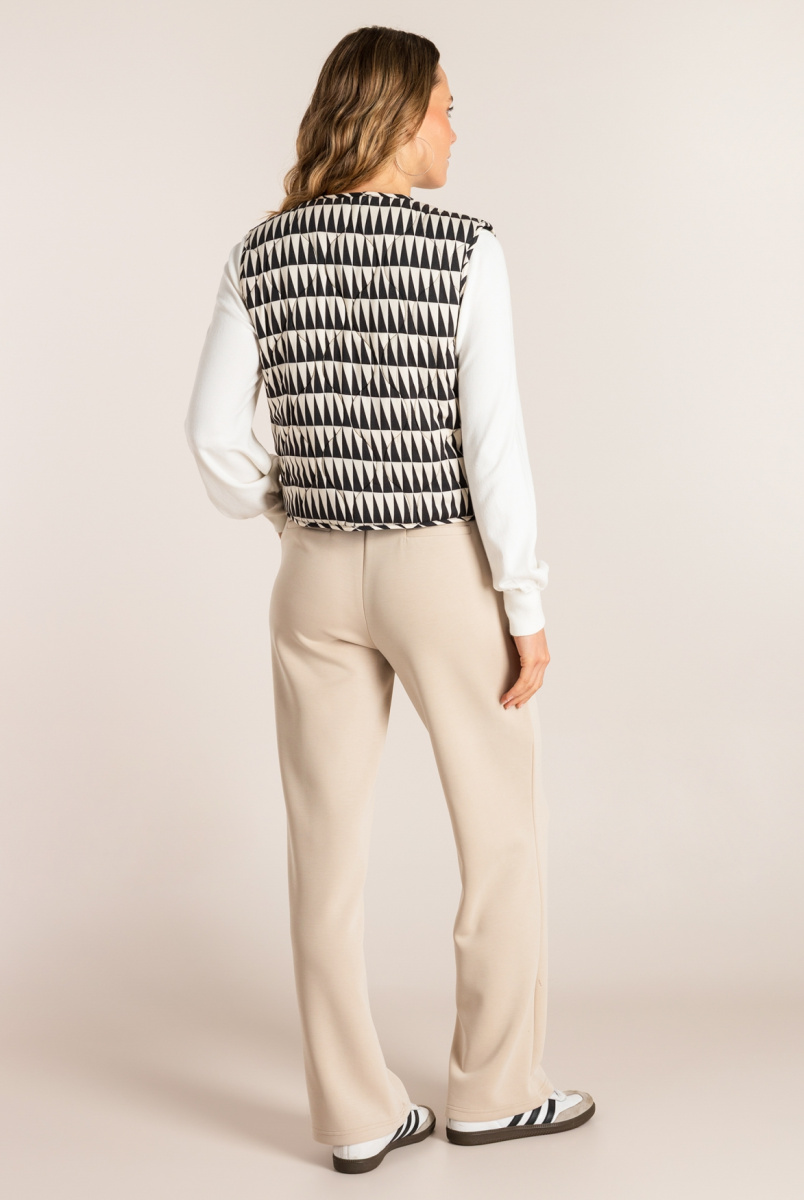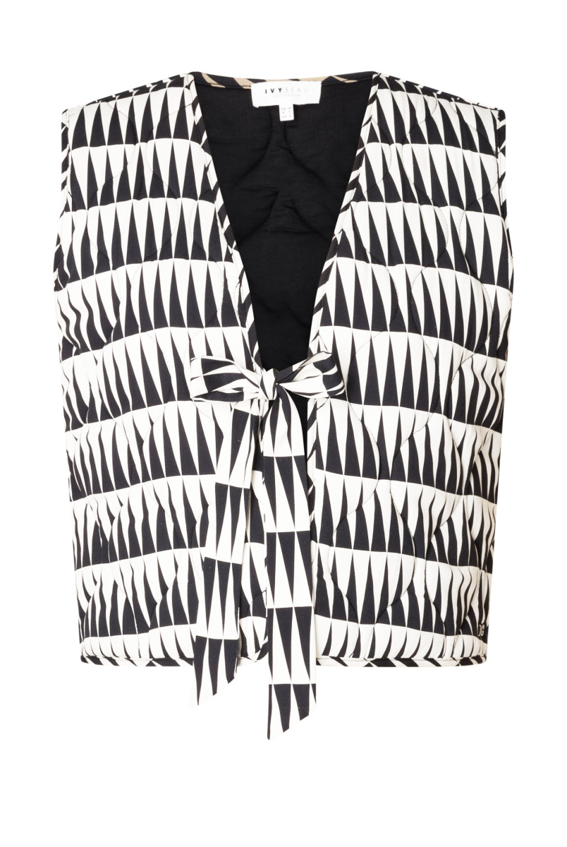 Op zoek naar een eyecatcher? Dit gewatteerde gilet in zwart grafisch dessin geeft elke outfit een boost! Het strikkoord in de taille zorgt voor een vrouwelijke vorm, terwijl de zachte wattering lekker comfy draagt. Leuk over een blouse, jurk of longsleeve.