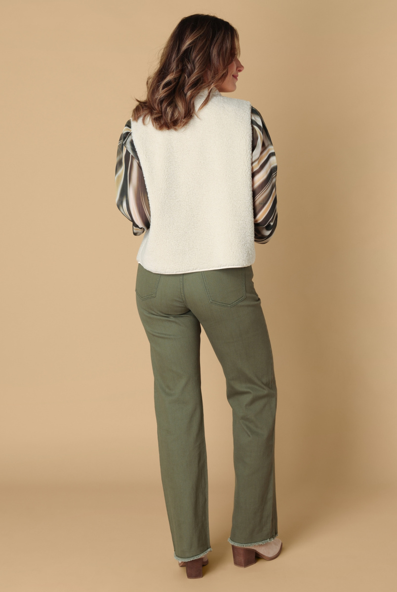 Deze bodywarmer is jouw zachte laag voor frisse dagen. Gemaakt van fluffy borg, mooi afgewerkt met een subtiele bies en een klein opstaand kraagje. Verkrijgbaar in off white en black—voor wie graag warm blijft, maar wél stijlvol. Materiaal:100% Polyester