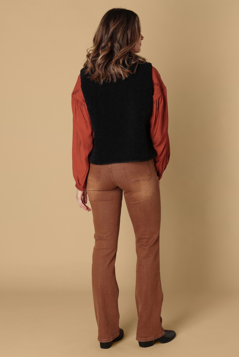 Deze bodywarmer is jouw zachte laag voor frisse dagen. Gemaakt van fluffy borg, mooi afgewerkt met een subtiele bies en een klein opstaand kraagje. Verkrijgbaar in off white en black—voor wie graag warm blijft, maar wél stijlvol.