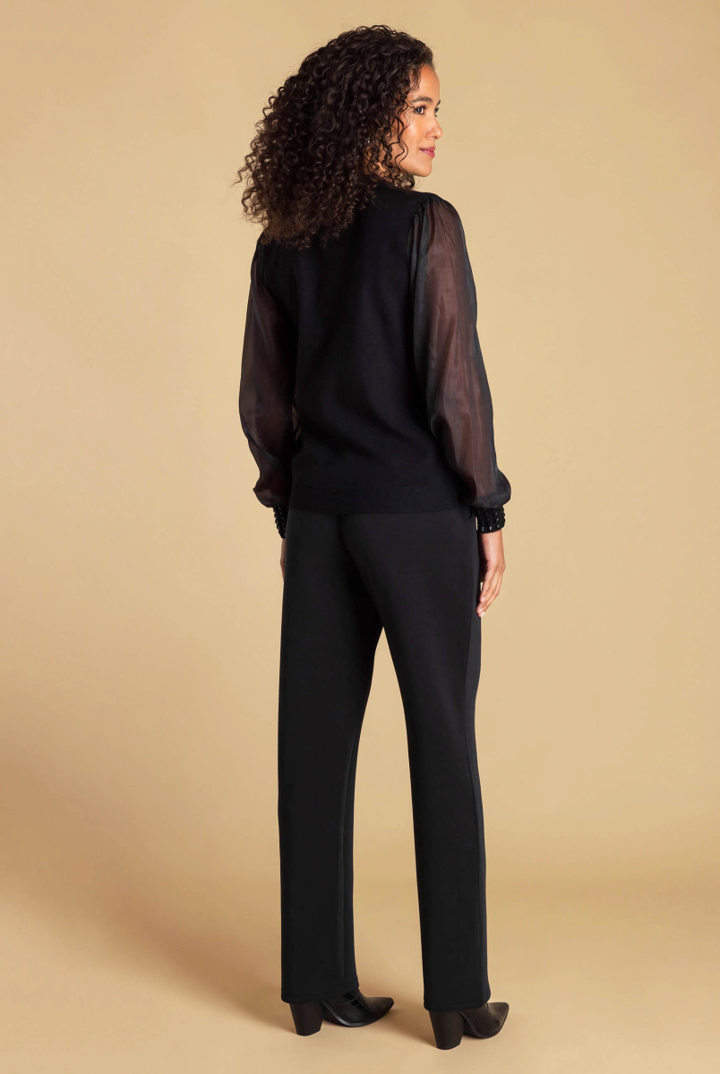 Deze Ivy Beau trui uit de feestcollectie combineert comfort met glamour. Het diepe zwart van het gebreide lijf contrasteert prachtig met de transparante mesh mouwen. De manchetten zijn afgewerkt met fonkelende glittersteentjes, wat een feestelijke en stijlvolle finishing touch geeft. Perfect voor decemberavonden.