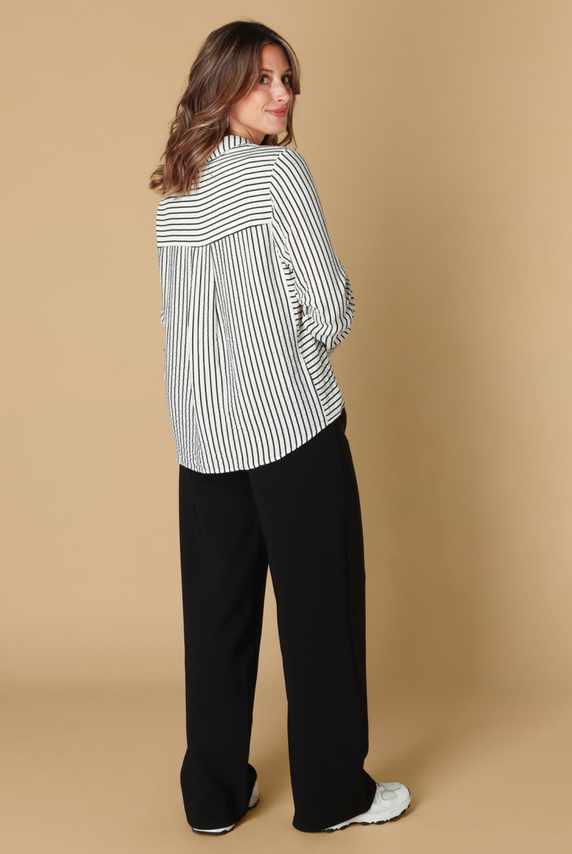Blouse Syra is een frisse klassieker met een moderne twist. De verticale strepen verlengen je silhouet, terwijl de zachte viscosemix soepel meebeweegt en comfortabel aanvoelt op de huid. Afgewerkt met elegante manchetten met knoop en een nette kraag—ideaal voor zowel casual als zakelijke looks.