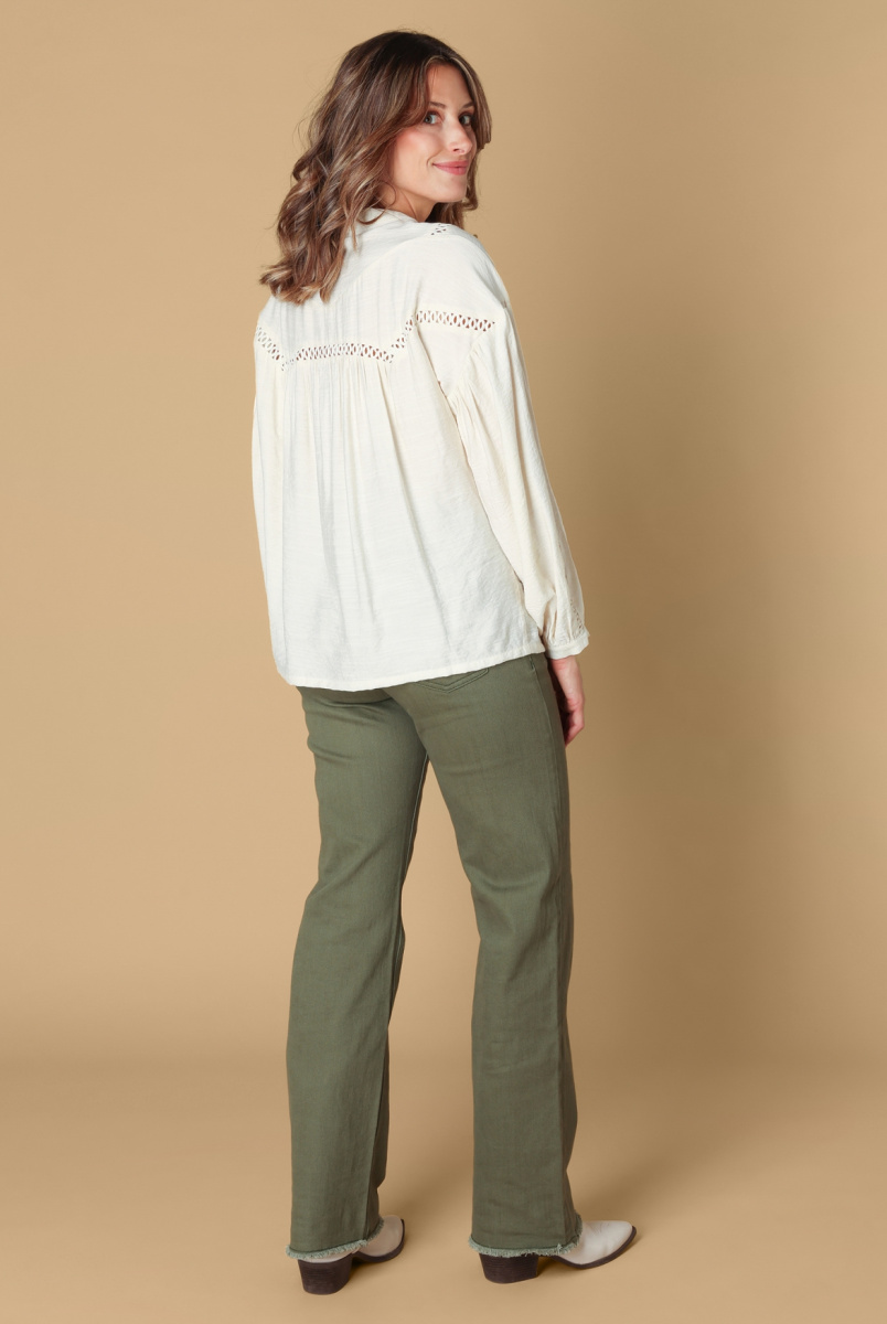 Zacht, luchtig en boordevol detail. Blouse Soumia is gemaakt van een soepele viscoseblend en speelt met contrast: wijde mouwen en fijne opengewerkte accenten zorgen voor een licht romantische look. De ronde halslijn met split geeft haar een nonchalante touch.