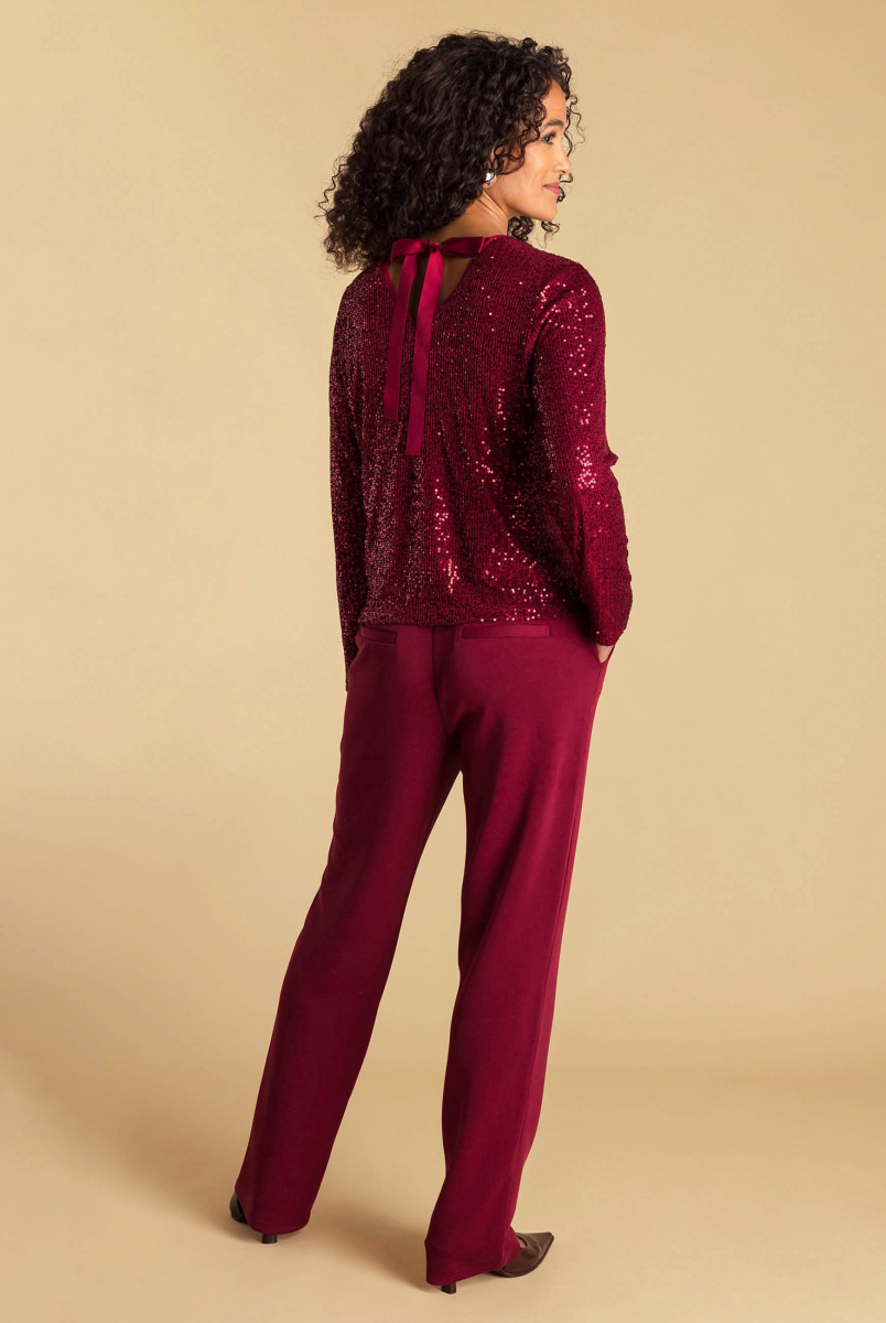 Feestelijk en stijlvol tegelijk! Deze top met lange mouwen is volledig bezet met glanzende pailletten die schitteren bij elke lichtval. De satijnen striksluiting achter maakt het geheel af en geeft een elegante touch. Perfect voor feestelijke gelegenheden.