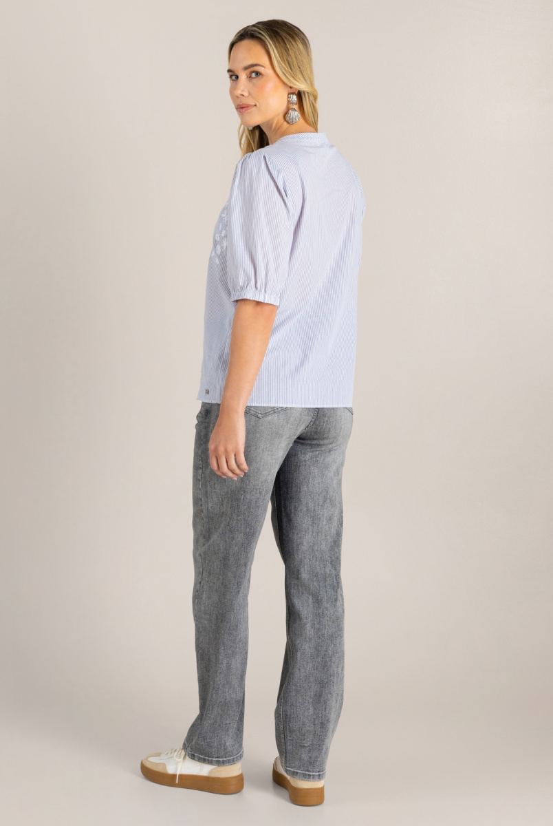 Een frisse blouse met subtiele details. Gaja is gemaakt van luchtig katoen met een fijne streep en heeft een rond halsje met kleine V-opening. De mouwen hebben een lichte pof en elastiek in de manchetten. Verkrijgbaar in een rood en in een blauw streepje.