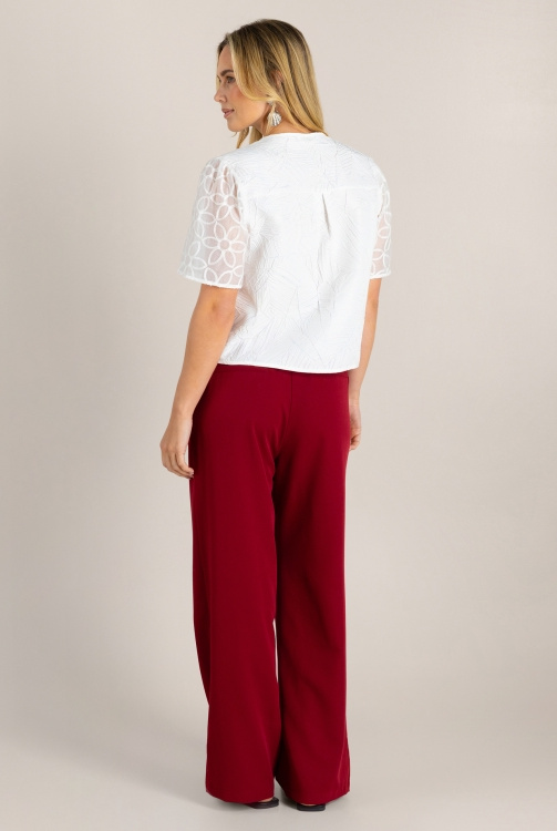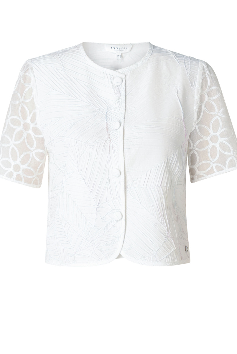 Giullia lijkt op het eerste gezicht een frisse witte blouse, maar heeft een verrassend detail. Het bladreliëf in de stof bevat een subtiele metallic glans die speels oplicht als je beweegt. Samen met de opengewerkte mouwen en het korte model zorgt dit voor een opvallende look.