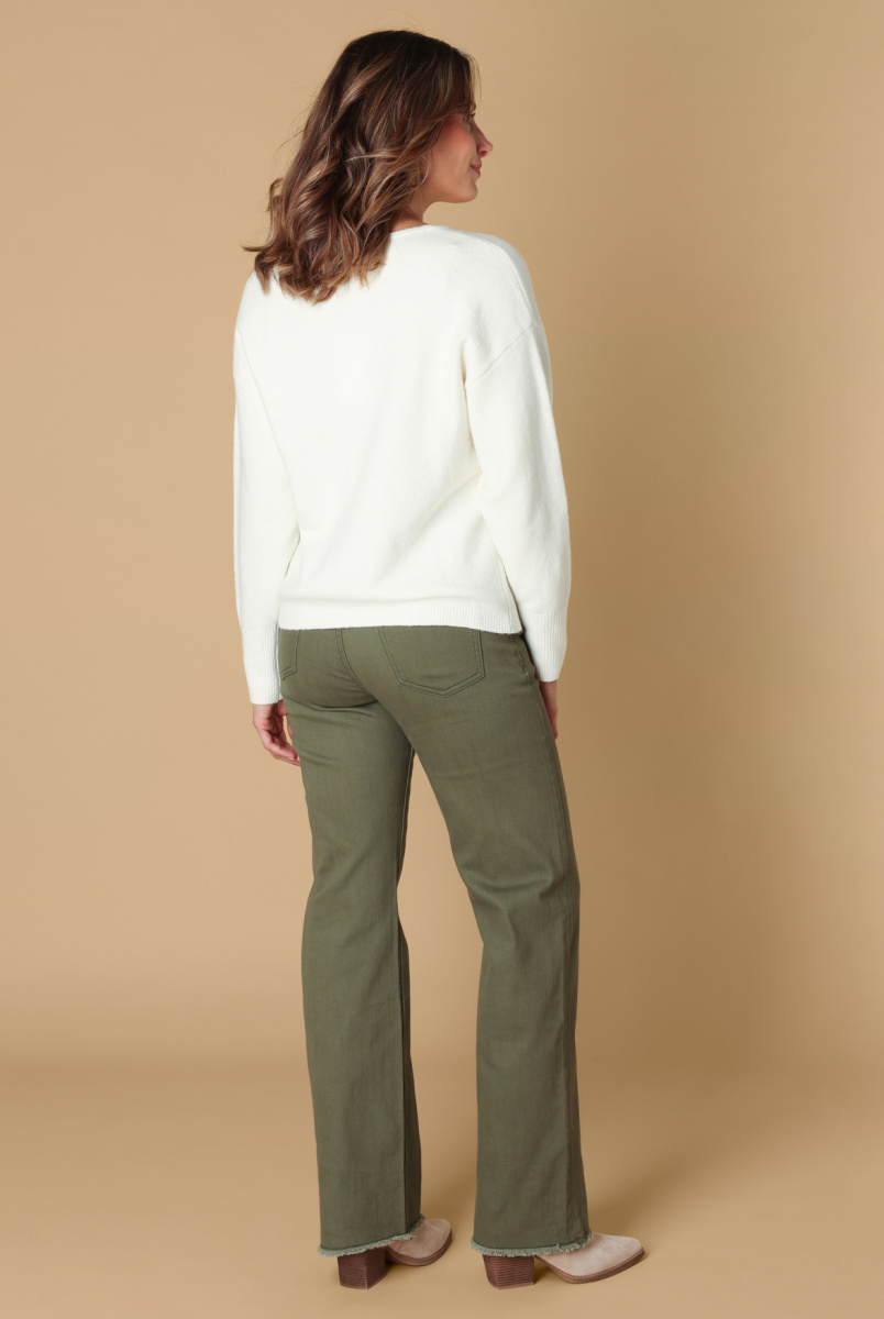 Minimalistisch met een cozy feel. Sophie is een gebreide trui in een zachte off white tint, gemaakt van een comfortabele mix mét een vleugje wol. De iets wijdere mouw en rechte pasvorm maken haar perfect voor elke dag.