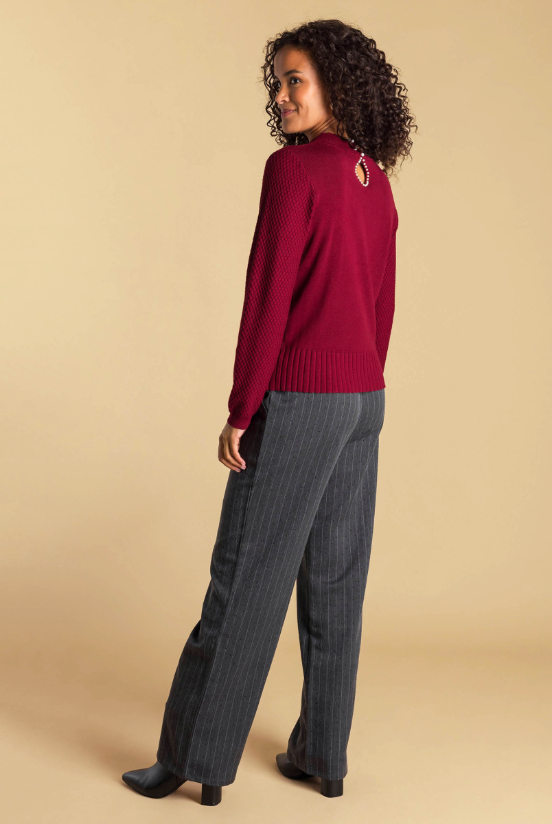 Deze gebreide trui is uitgevoerd in een viscose-polyamide mix die zacht en comfortabel draagt. Het subtiele structuurpatroon geeft extra diepte, terwijl de achterzijde verrast met een keyhole detail en knoopjes. Materiaal:72% Viscose, 28% Polyamide