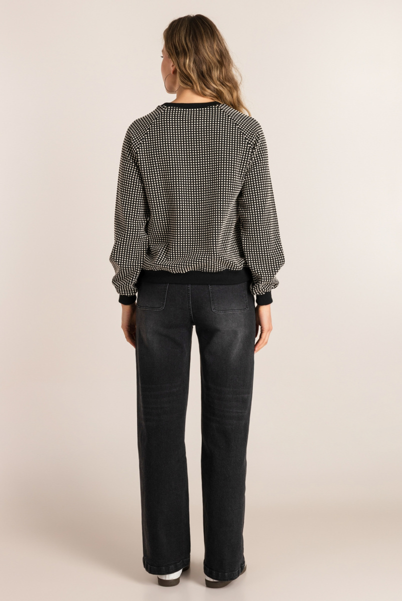 Comfort met een vleugje klasse! Deze zwart-witte sweater voelt heerlijk zacht aan en heeft een subtiel reliëf in de stof. De raglanmouwen en contrasterende boorden maken ‘m net even anders. Combineer met de matchende broek of rok voor een stijlvolle, easygoing look.