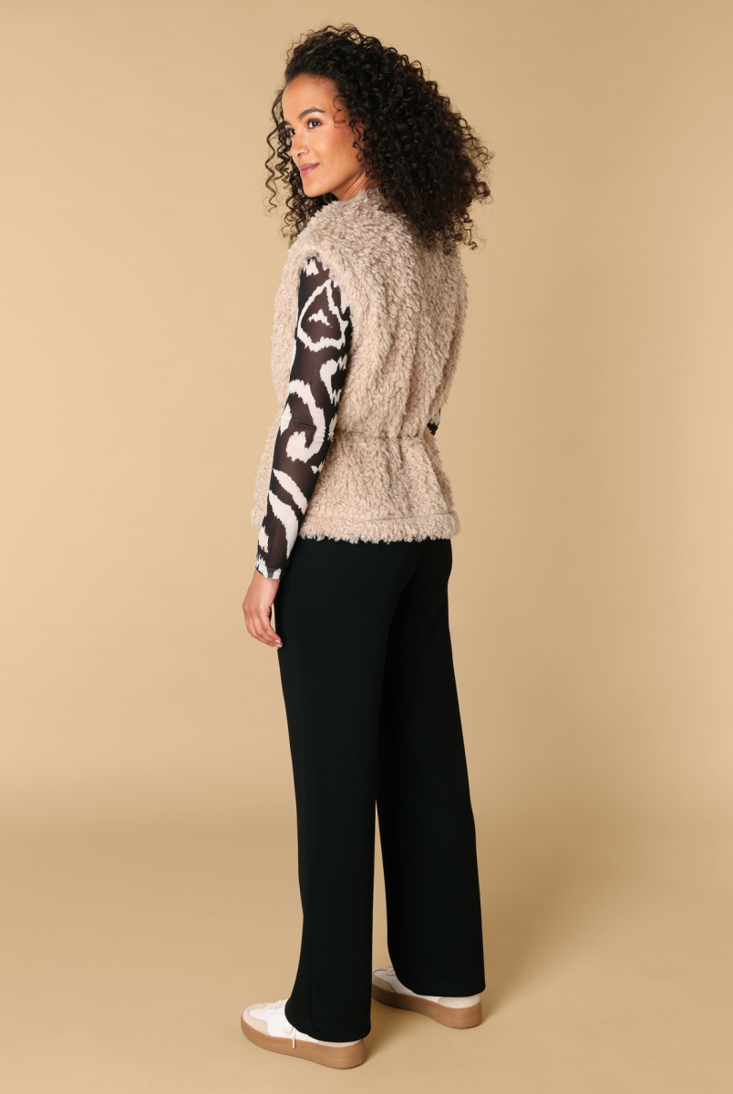 Een instant stijl-upgrade met knuffelgehalte. Dit furry gilet met fleece aan de binnenkant is heerlijk warm en superzacht. Met het los bijgeleverde gouden koordje creëer je eenvoudig een vrouwelijke shape. Materiaal:100% Polyester