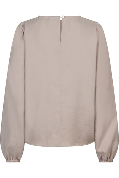 De Esmee Sparkle is een blouse met subtiele pofmouwen. De blouse is gemaakt van een licht glanzende stof en heeft een elastiek aan de onderkant van de mouwen. De Esmee Sparkle heeft een druppelvormige opening met een knoop aan de achterkant .