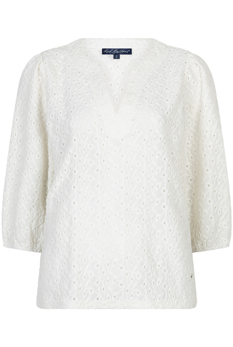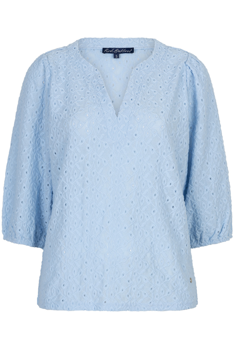 Top van Red Button in de kleur ecru en lichtblauw verkrijgbaar. De Top Ajour is gemaakt van broderie en heeft een V-hals. De top heeft driekwart ballon mouwen met elastiek aan het uiteinde van de mouw. Materiaal:95%polyester 5%elastane