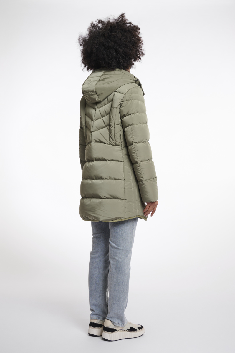 Deze gewatteerde damesjas heeft een hoge kraag, stormmanchetten en een capuchon met koordstoppers voor extra comfort dit seizoen. Het gewatteerde patroon en de rits- en drukknoopsluiting zorgen voor een vleugje charme. Deze jas is ook gevoerd, zodat je je de hele winter warm en omhuld voelt.