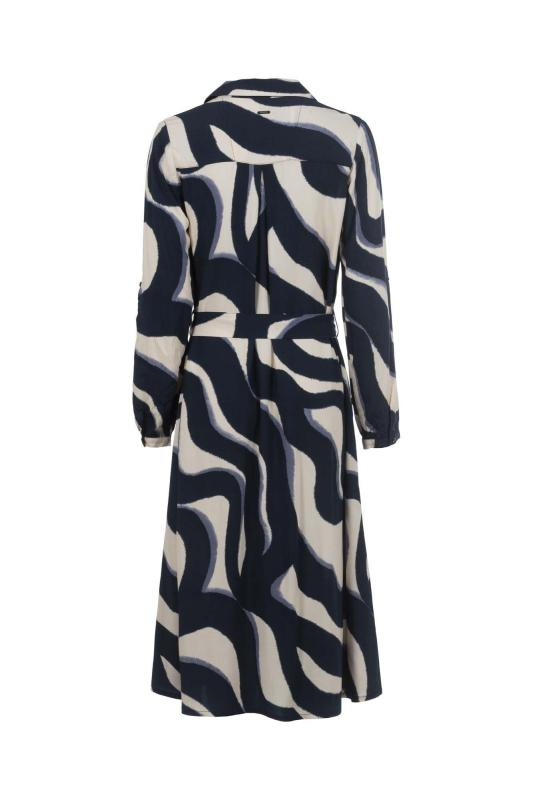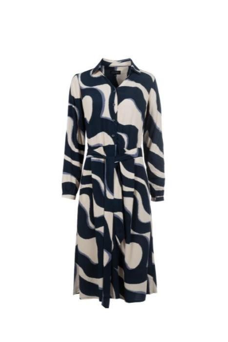 Een modieuze midi-jurk van geweven materiaal met een grafische all-over print. De blousekraag en de strikceintuur zorgen voor een flatterend, vrouwelijk silhouet. De mouwen kunnen eenvoudig worden opgerold en vastgezet met een lipje. Een veelzijdig kledingstuk voor diverse gelegenheden.