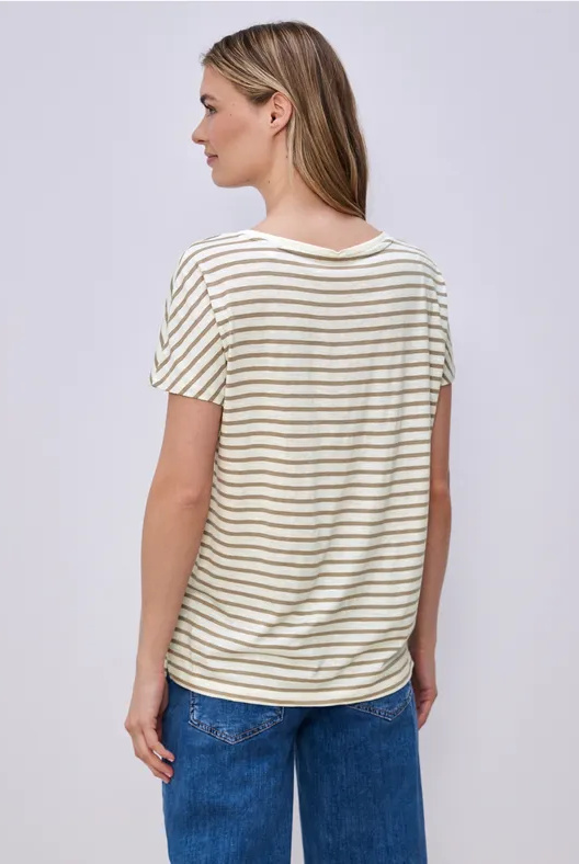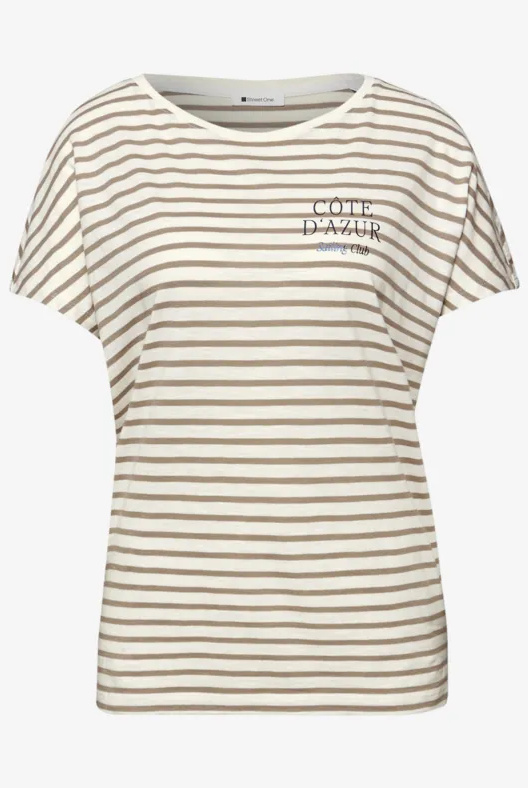 Shirt van Street One in de kleur beige verkrijgbaar. Jersey shirt Vrijblijvend Ronde hals Uitgezakte schouders Maritiem en veelzijdig Materiaal:50% katoen 50% modal