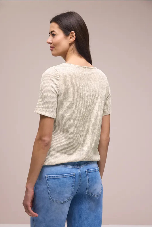 Shirt van Street One in de kleur zand verkrijgbaar. Jersey shirt Vrijblijvend Boothals Korte mouw Tweekleurige look Materiaal:68% katoen 30% polyester 2% elastan