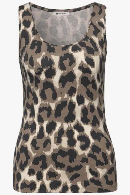 Top van Street One in de kleur beige verkrijgbaar. Jersey top Vrijblijvend Ronde hals Mouwloos Zomerse blikvanger Materiaal:48% Katoen 48% Modal 4% Elasthaan
